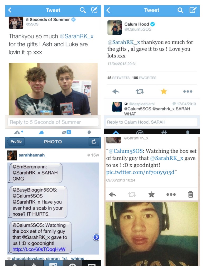 I still remember this moment, as right after the call, I needed to sit down, and the girls I started talking to, who were hoping I meet all of 5SOS, all hugged me and congratulated me and said that I need to hang around now for them to arrive. Which is what I did. Unfortunately, I never managed to meet all of 5SOS at this moment, but someone came out from the arena who happened to be 5SOS’ tour manager, at the time, called Al, who took my bag of presents which he kindly gave to 5SOS when they arrived at the arena. I remember nearly missing my train at Birmingham New Street when Calum and the 5SOS band account tweeted me to thank me for the gifts. I distinctly remember this happening so fast, as I was sat at a charging port in New Street to charge my, at the time, iPhone 5s (HAHA!), when I noticed the tweet came through and then my phone LITERALLY went crazy, with tweets such as “OMG SARAH!” and “OH MY GOD THAT’S AMAZING” I was sat there, scrolling through as much as I can before having to find the platform and board the train I needed to get back to London. I don’t think I looked up from my phone the whole journey back, it was that crazy on my Twitter mentions and feed!
