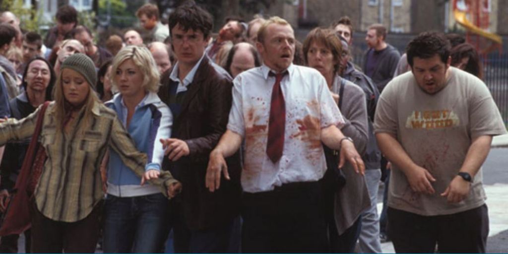 The plot of this film revolves around Shaun (Simon Pegg), a 30-something who enjoys his easy existence and a life centered around socializing at the local pub. When he isn’t at work, he is at his small flat with his best friend Ed (Nick Frost), where he has a girlfriend who brings unpredictability to his life, who wishes for Shaun to grow up and be a man. When the town, on the outskirts of London, becomes overrun by Zombies, Shaun finds he has to rise to the occasion to protect the ones closest to him, including his girlfriend and his mum.
