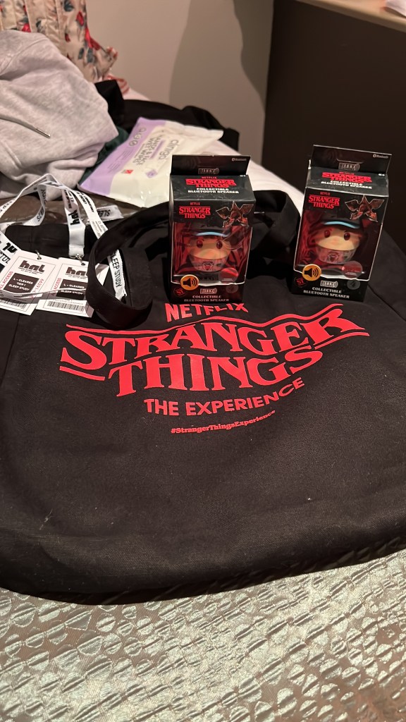 I had bought two VIP tickets, one for me and one for someone I knew from being a fan of a band I like. Still, she never showed up, so I was alone – and as annoyed as I had been, I enjoyed this event far better on my own – I got two VIP lanyards, two free drink vouchers, two free gift bags – which was a Stranger Things: The Experience Tote Bag(s), and Dustin Bluetooth speaker(s).